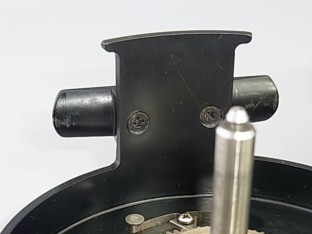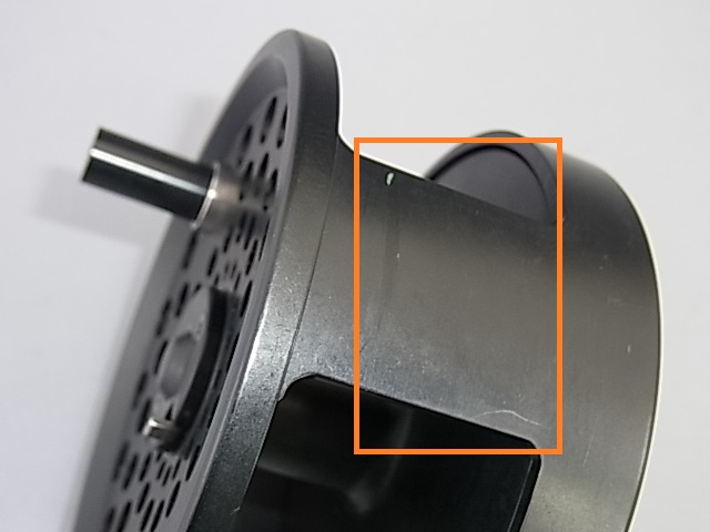 バックプレートとピラーに擦り痕があります(橙色□)が打痕はなく、全体は良好な状態です。作動はスムーズでディスクの効きも良く(ブレーキパッドも2点仕様,、ロータやベアリングハウジングなども厚めで強化されているようです。)、レバー調整のためノールックで操作が容易です。内部の調整ネジを上下することで更なる強弱設定も可能です。